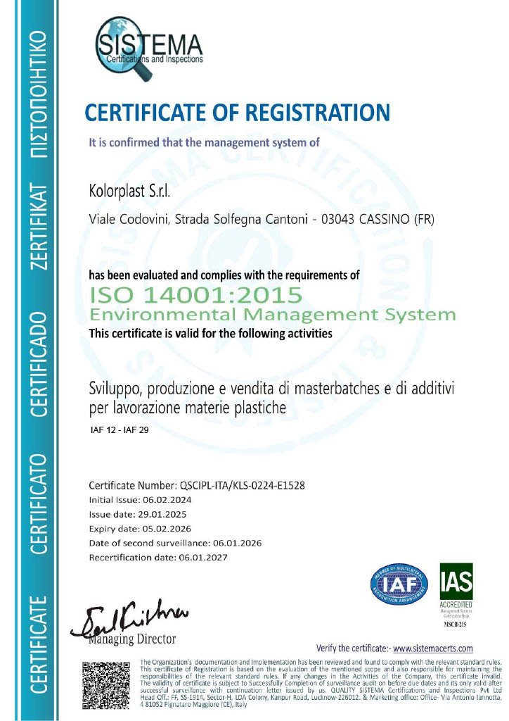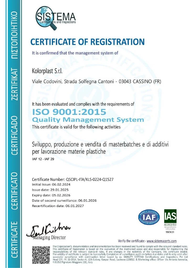 KolorPlast è certificata Federitaly “Made in Italy”, a seguito di rigorosi e meticolosi controlli sul processo produttivo e organizzativo.